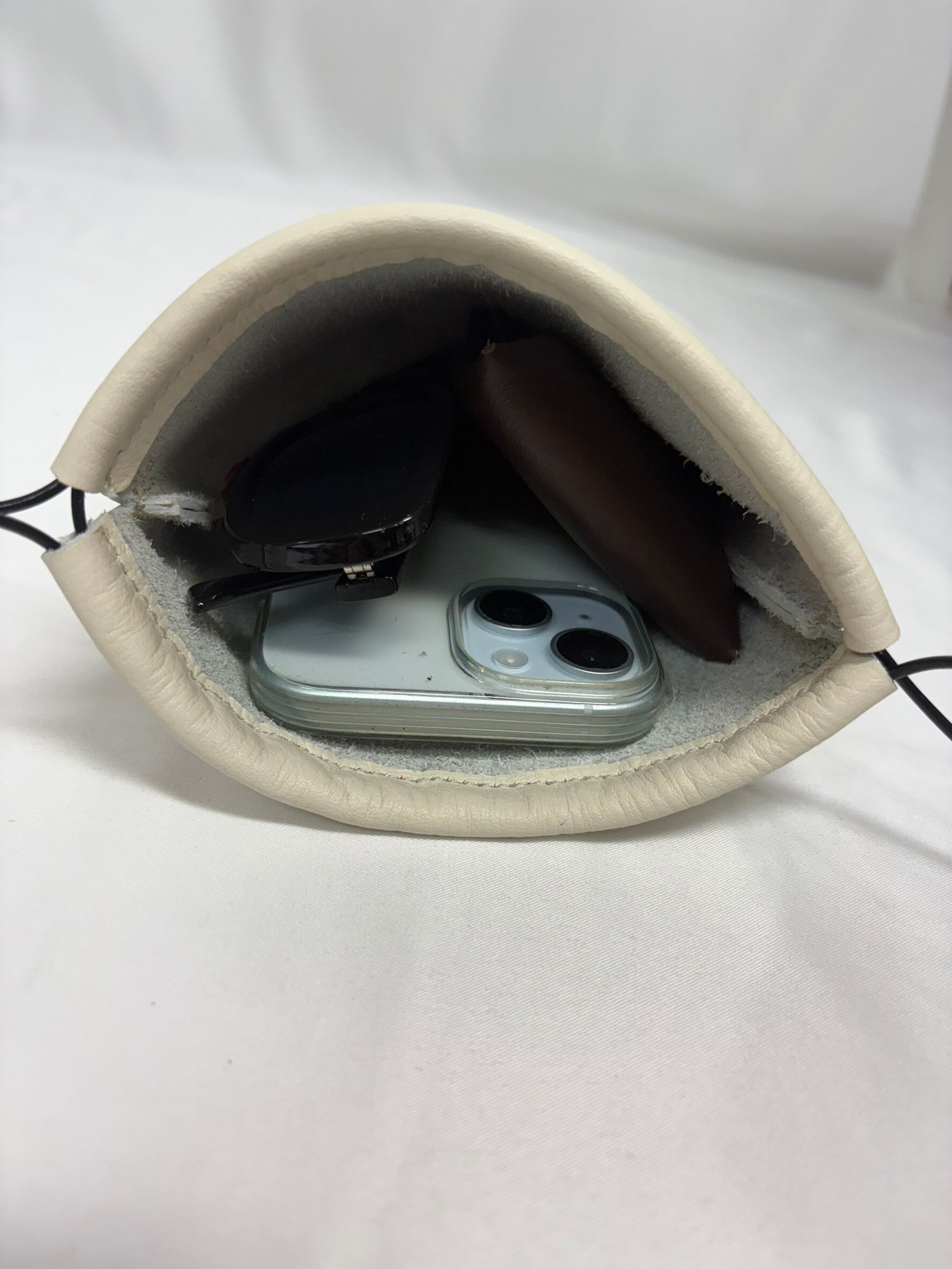 スマホ、二つ折り又は三つ折りの財布が入るサイズ感です。長財布は少し出てしまいますので、ご注意ください。