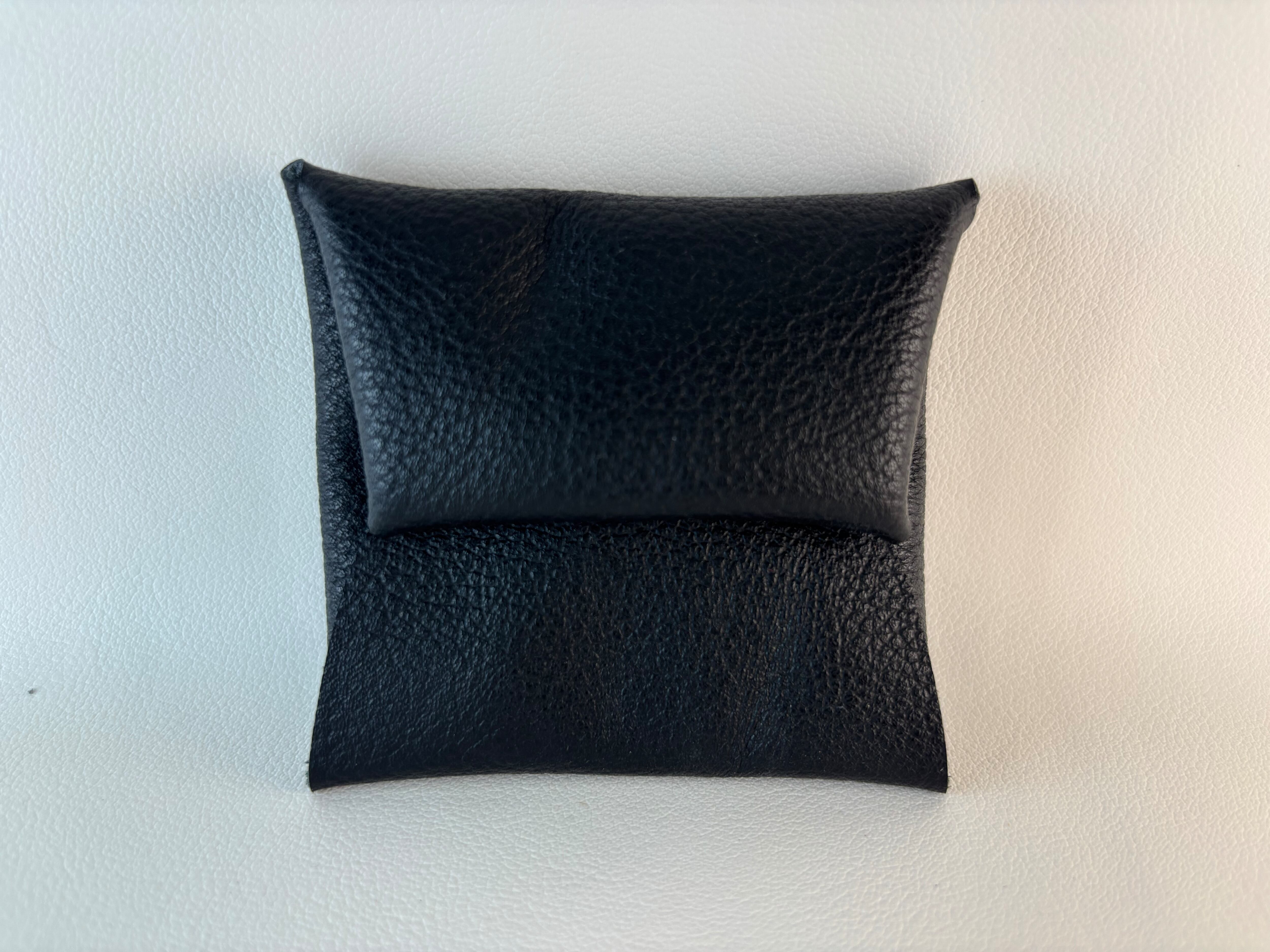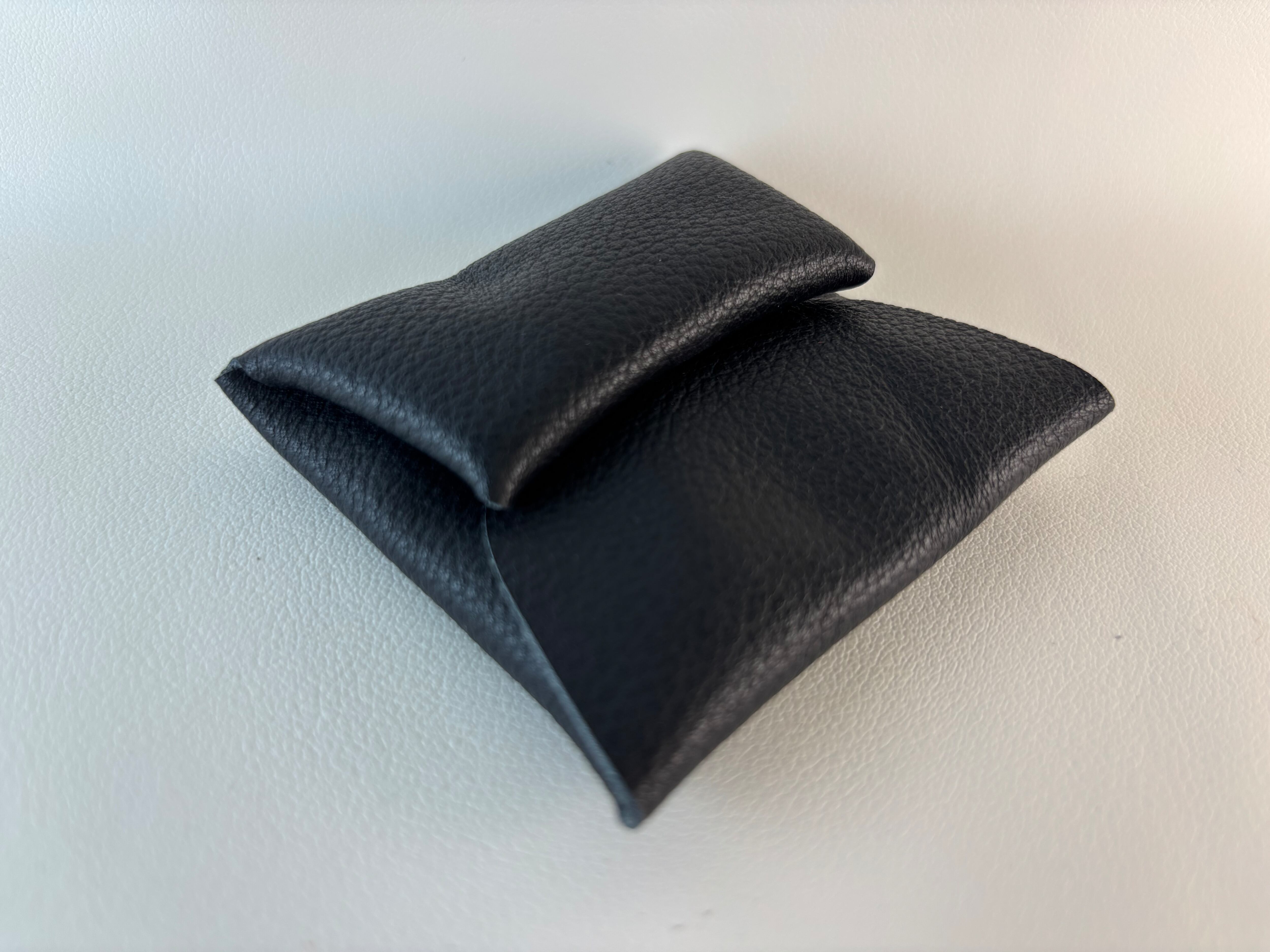手のひらにすっと収まる、1枚革で作られた7cm角のシンプルなコインケース