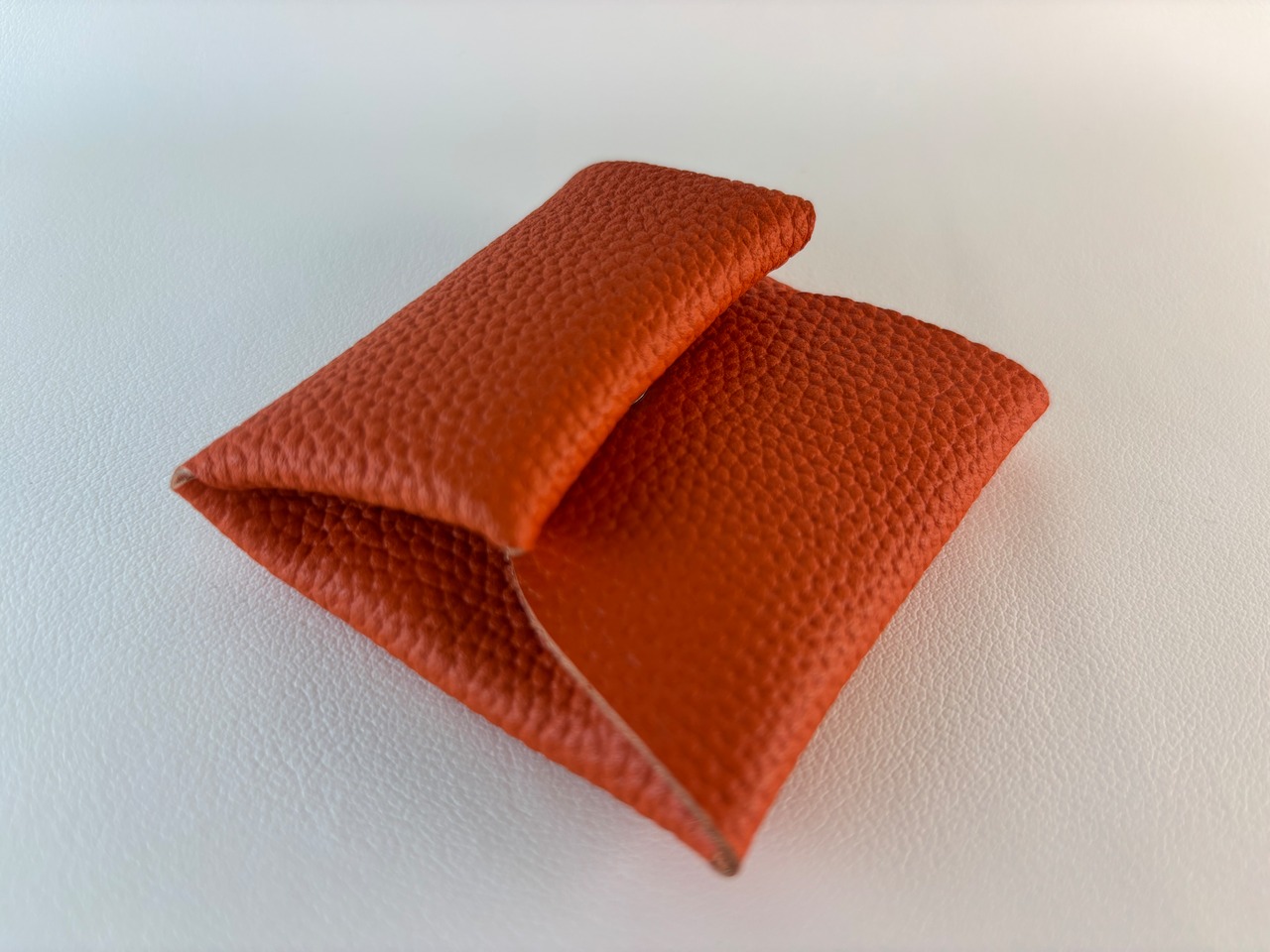 手のひらにすっと収まる、1枚革で作られた7cm角のシンプルなコインケース