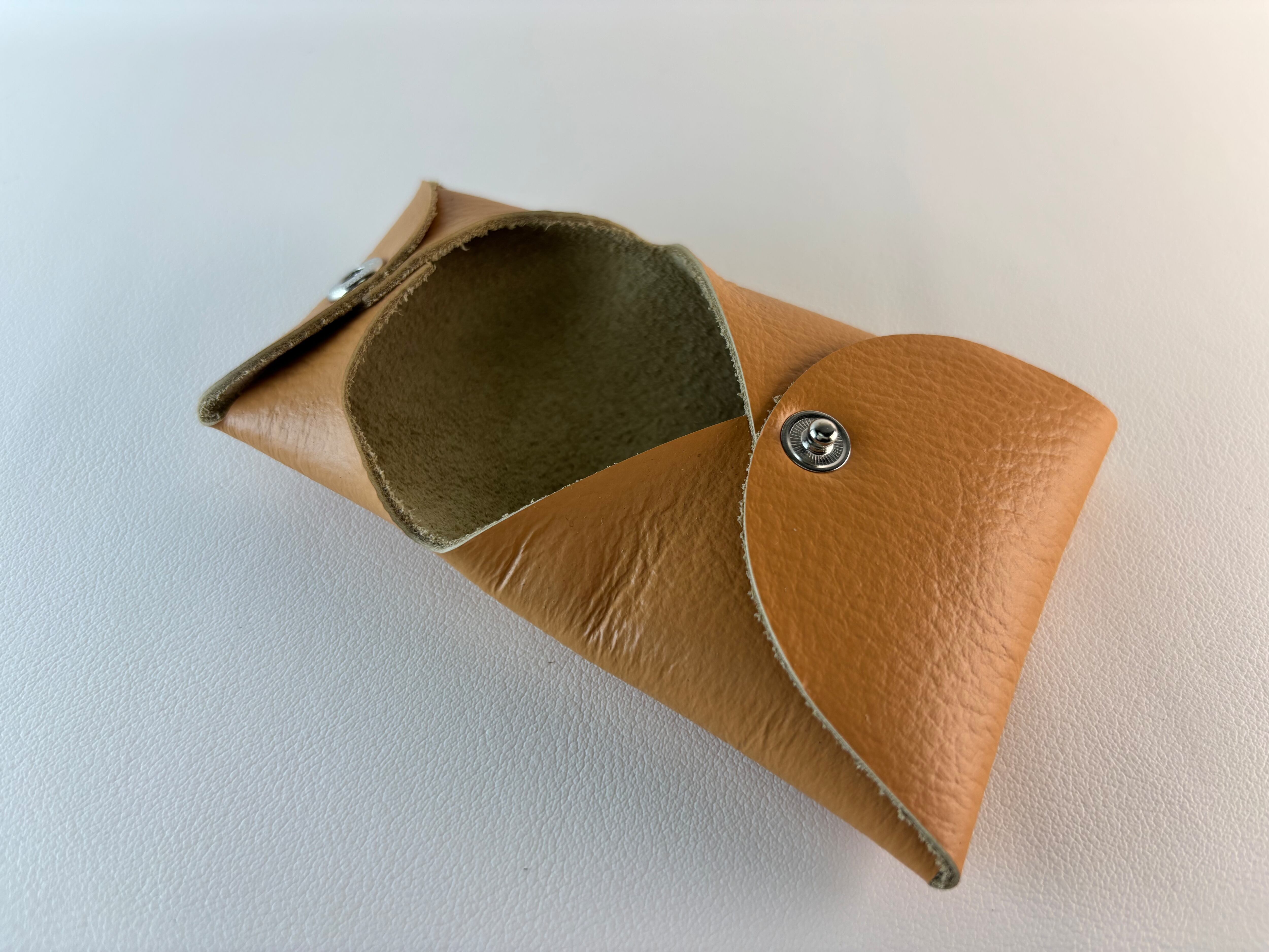 手のひらにすっと収まる、1枚革で作られた7cm角のシンプルなコインケース