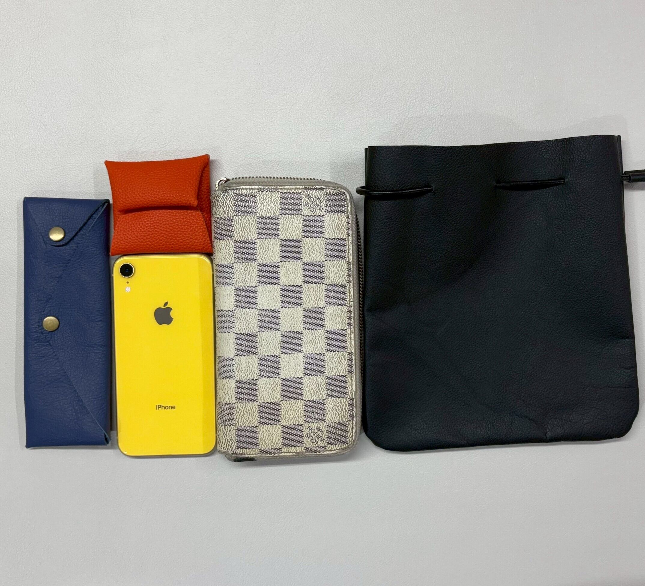スマホ、二つ折り又は三つ折りの財布が入るサイズ感です。長財布は少し出てしまいますので、ご注意ください。