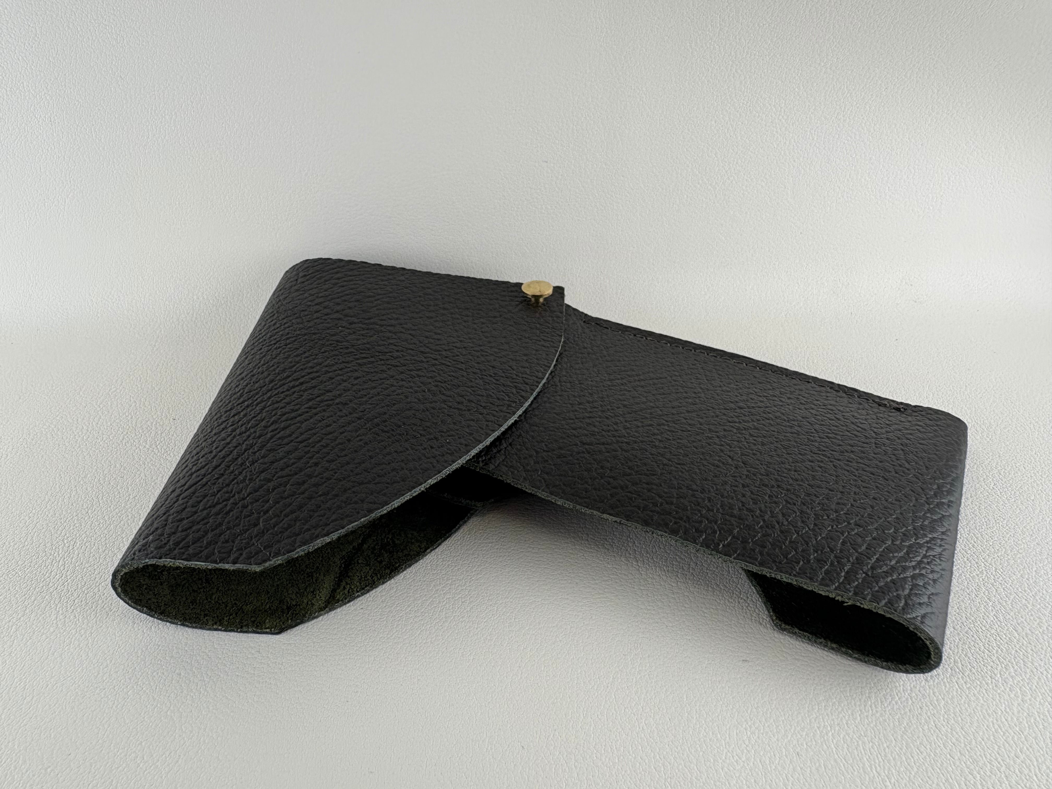 こちらは、シボのある黒に近い深緑色の革で作られています。