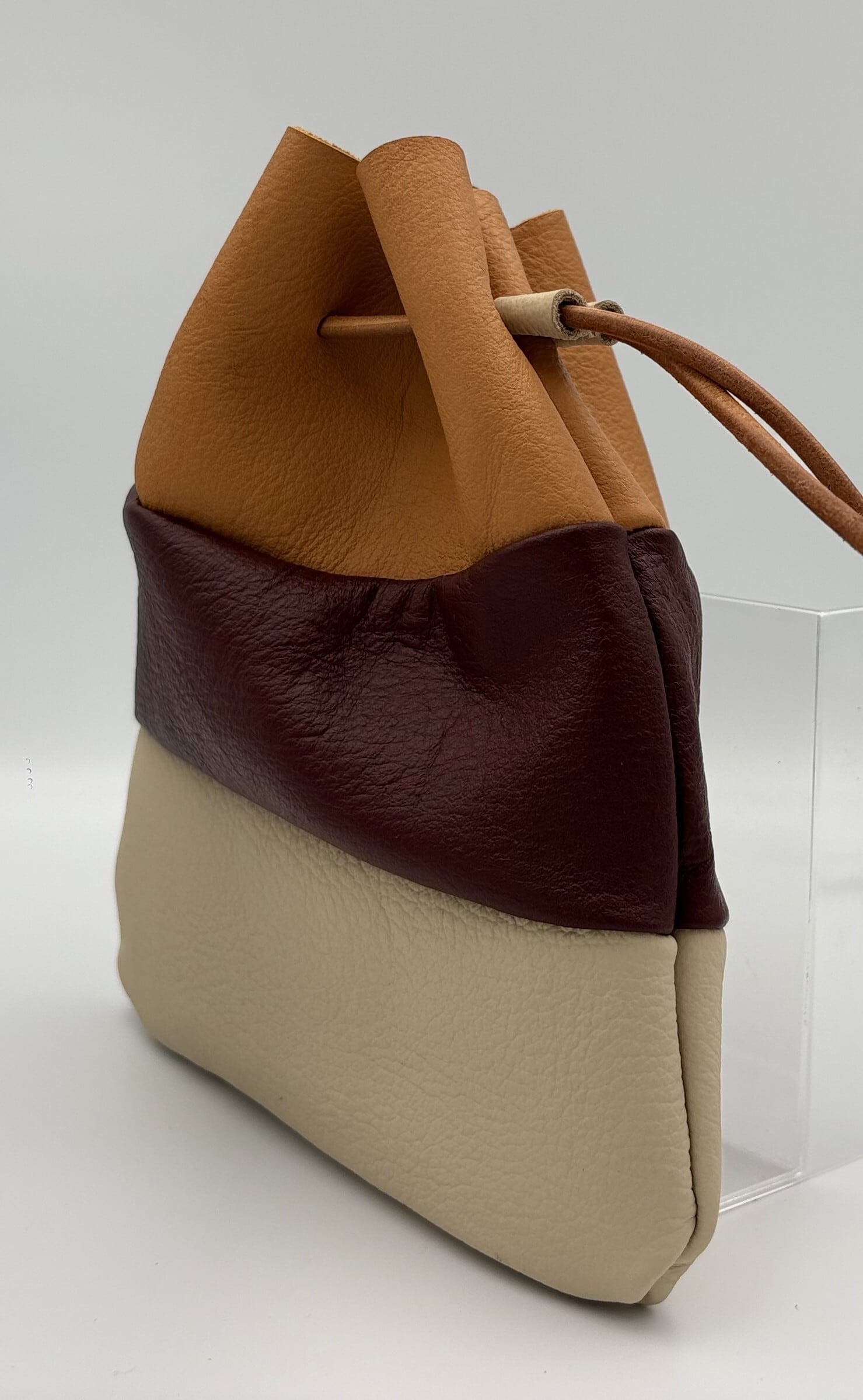 こちらは、マスタード、えんじ色、アイボリーの本革で作られたポーチ大(巾着バッグ)です。