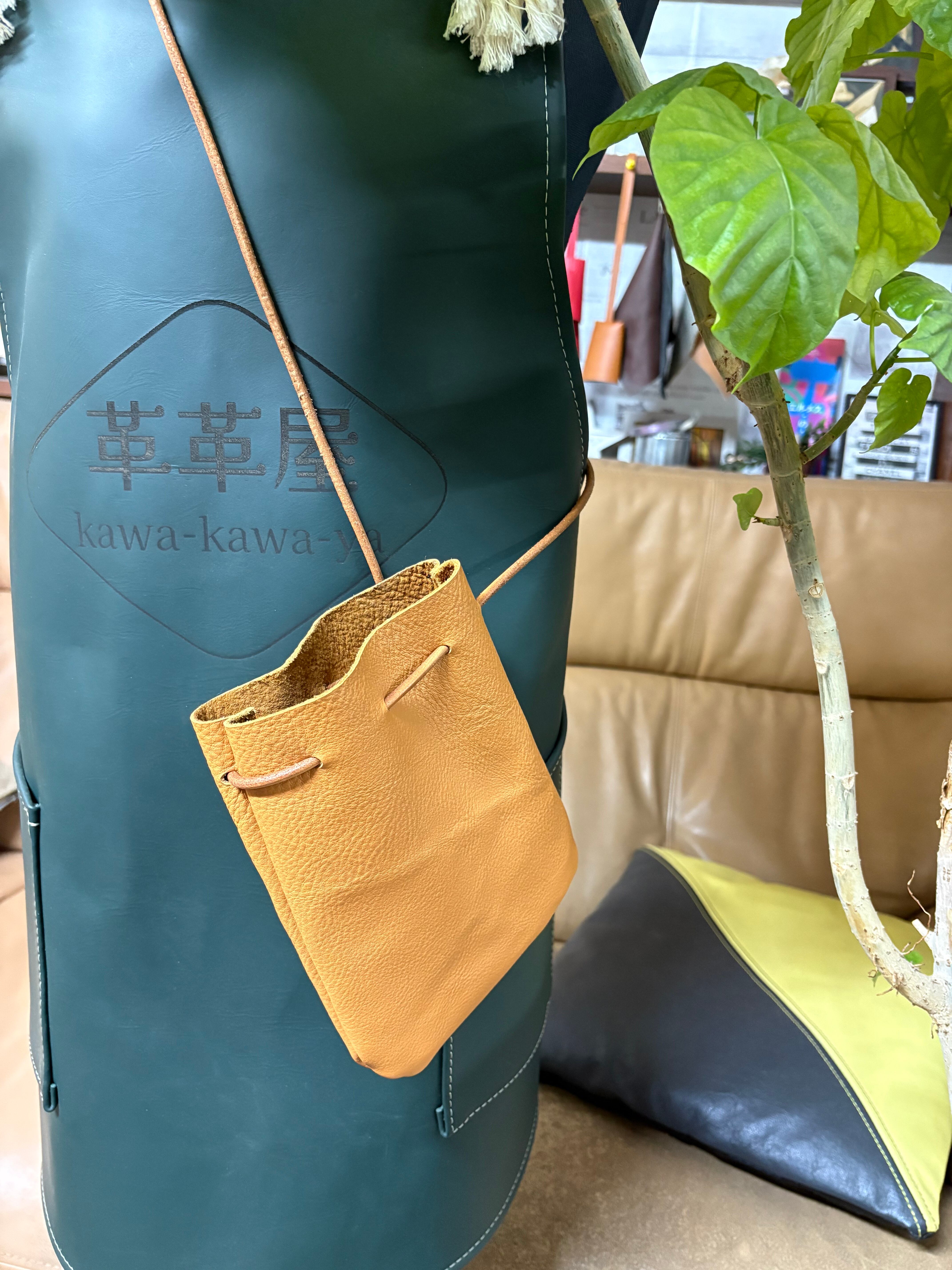こちらは、薄いピンク色の本革で作られたポーチ(巾着バッグ)です。