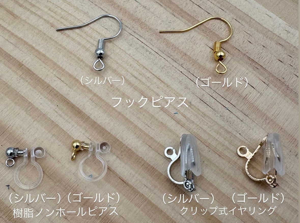 商品詳細:本革製、フック式ピアス、樹脂ノンホールピアス(イヤリング)、クリップ式イヤリングへの変更可能、金具の色はそれぞれゴールドとシルバーから選択可