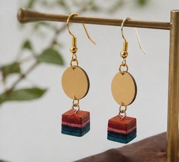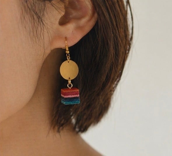 デザインは、1.5㎝の円の下に1㎝のカラフルなキューブがぶら下がる形状で、床面の処理はしていない為、革の風合いを引き立てています。軽やかな着け心地も特徴で、長時間のお洒落を楽しむ方にも最適です。